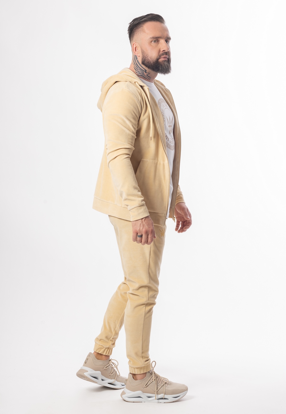 Męska bluza z kapturem w klasycznym fasonie. Zasuwana na charakterystyczny złoty zamek, którego odcień komponuje się kolorystycznie z kremowym kolorem bluzy. Ten model jest pozbawiony zbędnych wzorów – na przedniej części bluzy znajduje się haftowane logo marki. Zastosowany materiał dobrze prezentuje się na męskiej sylwetce, podkreślając jej atuty. Kremowa welurowa bluza z kapturem ma dwie, wyszyte z przodu kieszenie.