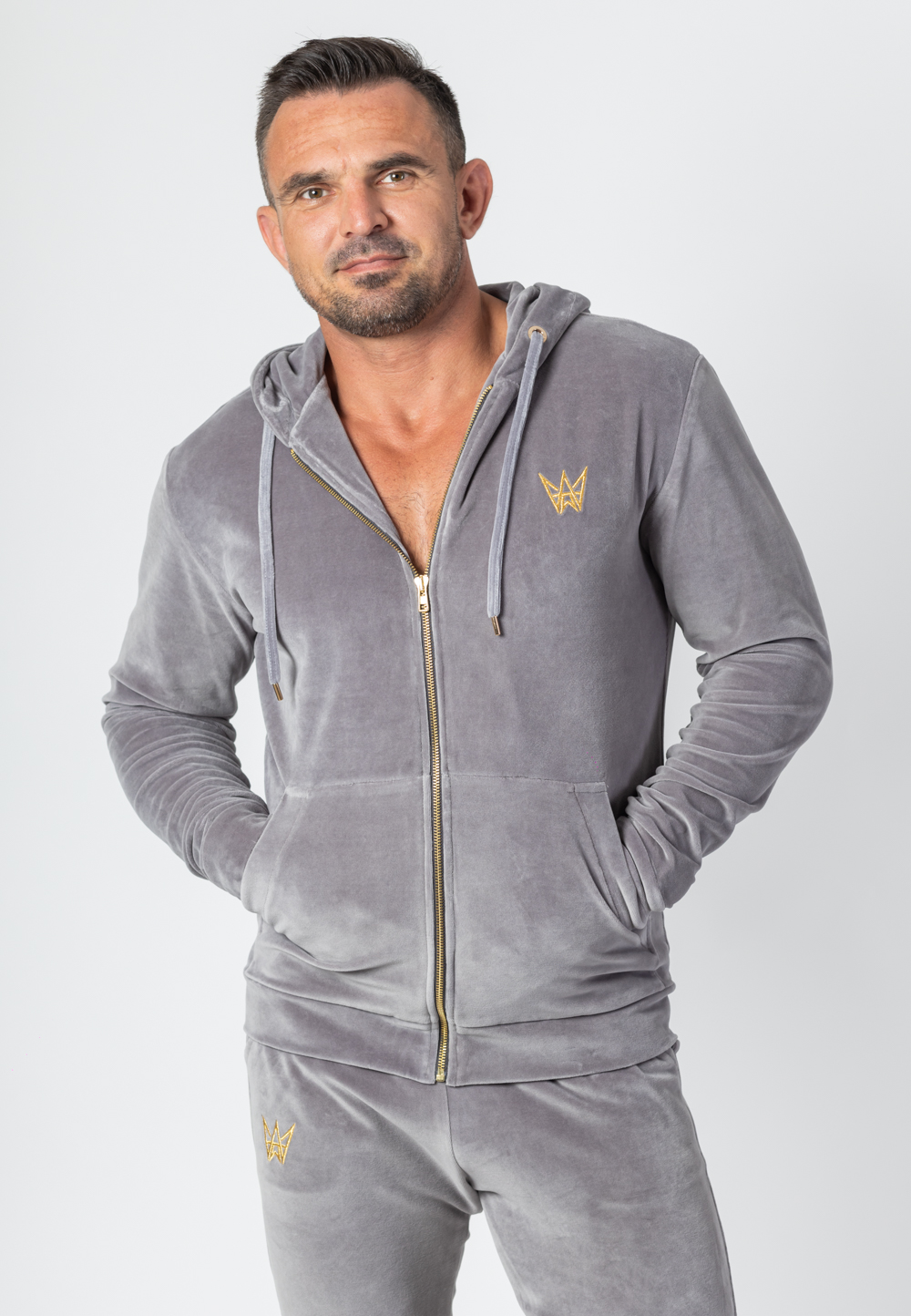 Męska bluza w klasycznym kroju, szara, rozsuwana na zamek w złotym kolorze. Kaptur z regulowanymi sznurkami zapewnia wygodne dopasowanie. Model z dwoma praktycznymi kieszeniami. Bluza bez dodatkowych wzorów, ozdobiona jedynie haftowanym logo Tres Amigos.