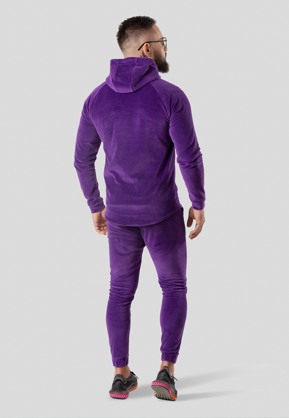 Stylowy komplet dresowy z fioletowego weluru, przeznaczony dla dynamicznych mężczyzn, stanowi doskonały wybór na każdą okazję. Ten zestaw, zaprojektowany przez Tres Amigos, obejmuje wygodną bluzę z kapturem oraz spodnie typu jogger z elastycznym ściągaczem w pasie i na nogawkach. Można je nosić zarówno razem, jak i osobno, co pozwala na tworzenie różnorodnych stylizacji. Idealnie pasujące do sportowego obuwia. Komplet do noszenia razem i oddzielnie.