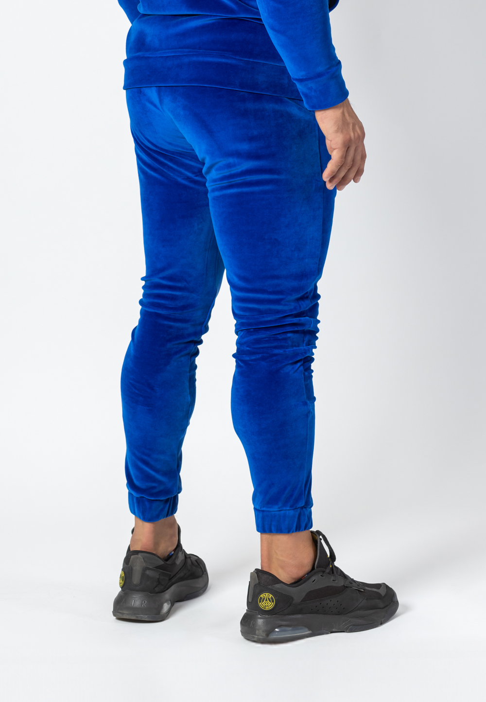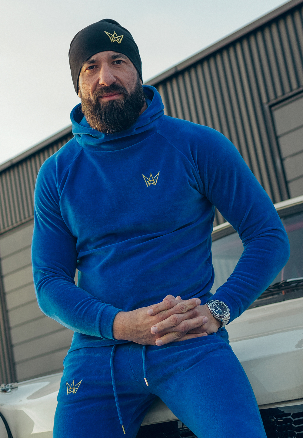 Komplet wykonany z miękkiego, odpornego na zagniecenia materiału. Welur zapewnia doskonały komfort noszenia, elastyczność oraz idealne dopasowanie do sylwetki. Dzięki swojej strukturze materiał nie wymaga prasowania, co jest dużym ułatwieniem. Głęboki, niebieski kolor nadaje dresom nowoczesnego, a jednocześnie klasycznego wyglądu. Złote akcenty, takie jak zamek błyskawiczny i logo marki, nadają im wyjątkowy charakter, sprawiając, że są nie tylko wygodne, ale także stylowe i praktyczne.