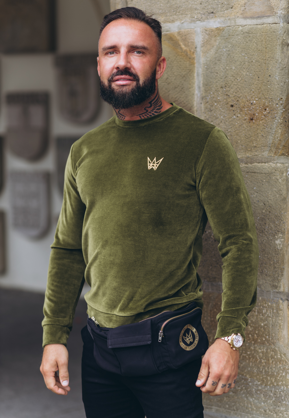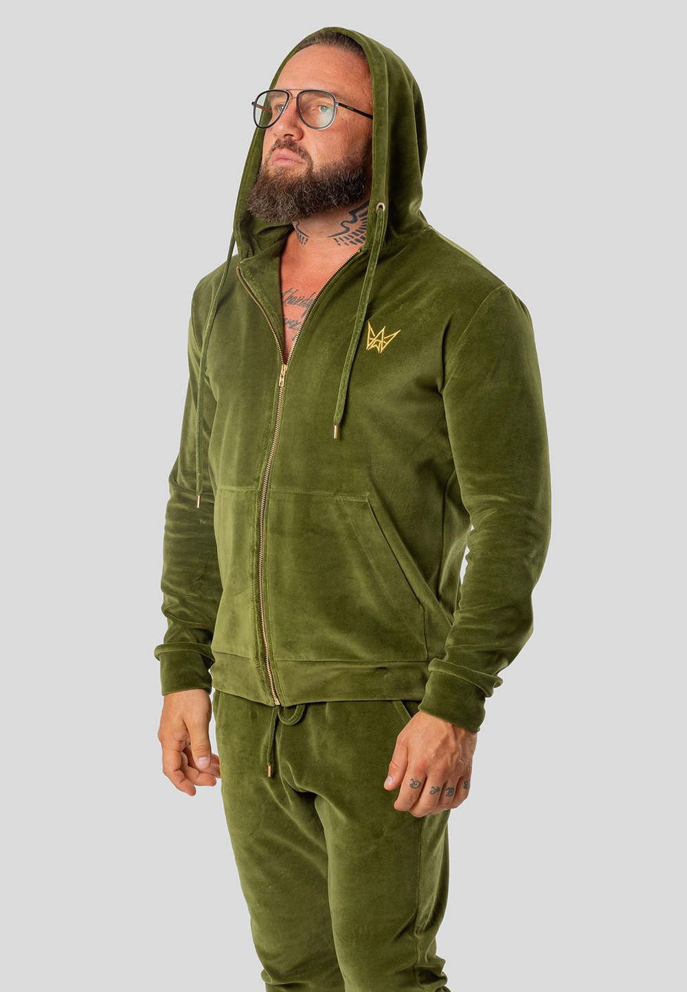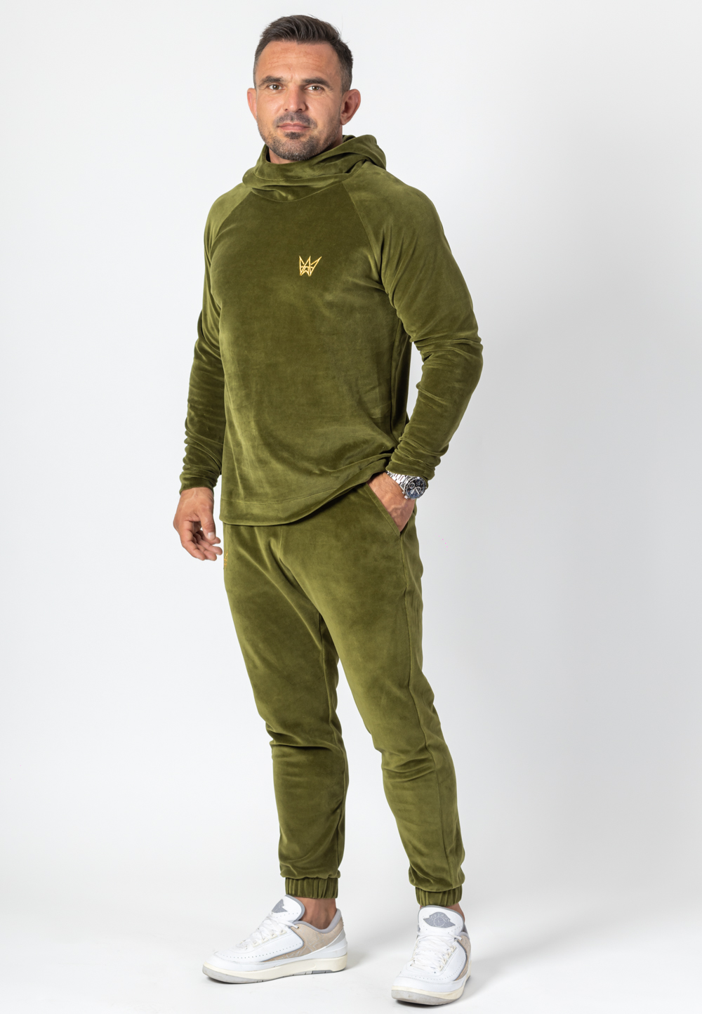 W tym modelu zastosowany welur – modną tkaniną o charakterystycznym wyglądzie. Miękki, lekko błyszczący materiał odporny na zagniecenia. Zaletą tego kompletu jest oryginalny odcień zieleni. To modny i neutralny kolor jest odmianą dla czarnych i brązowych ubrań.