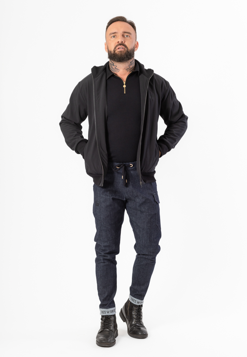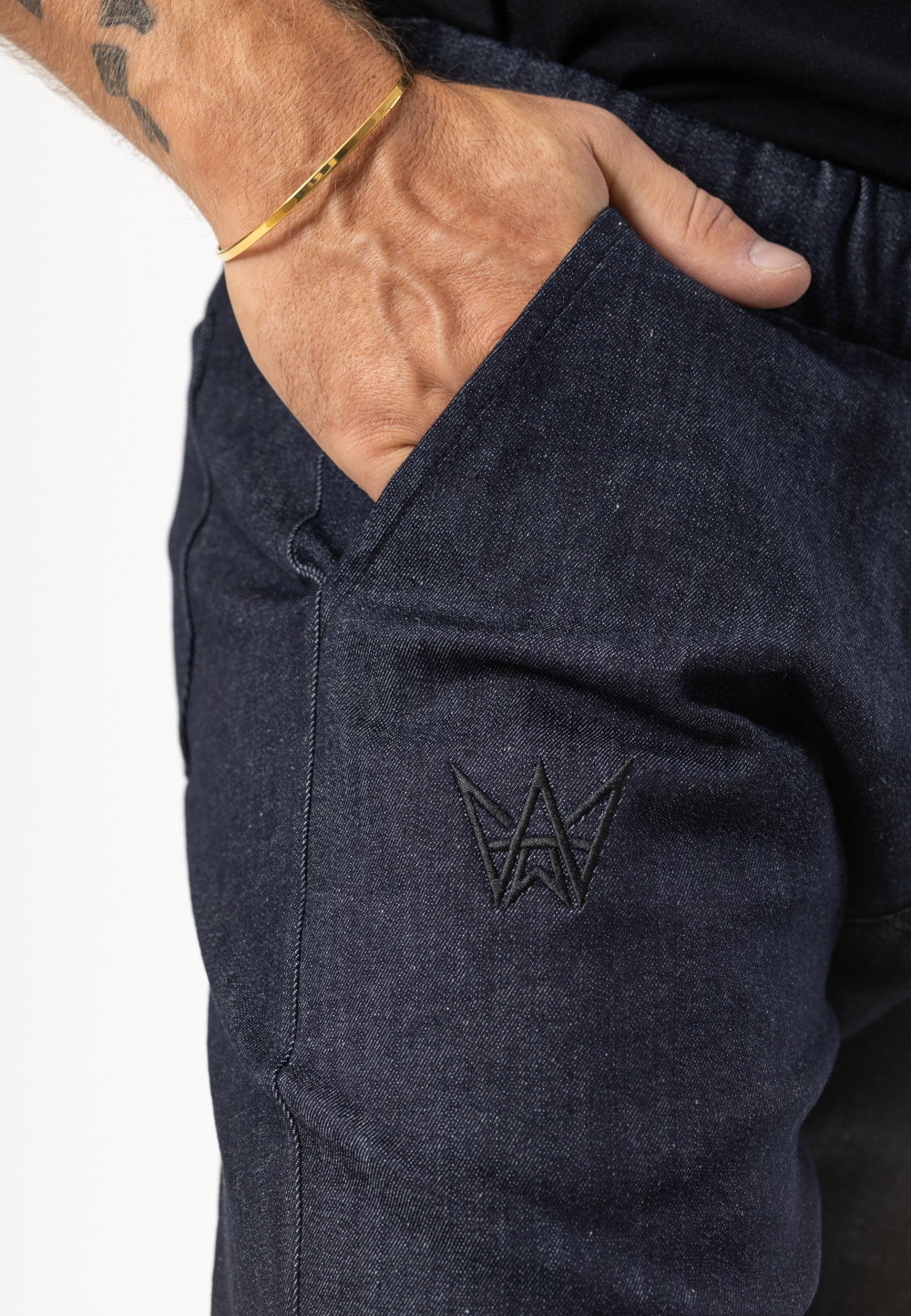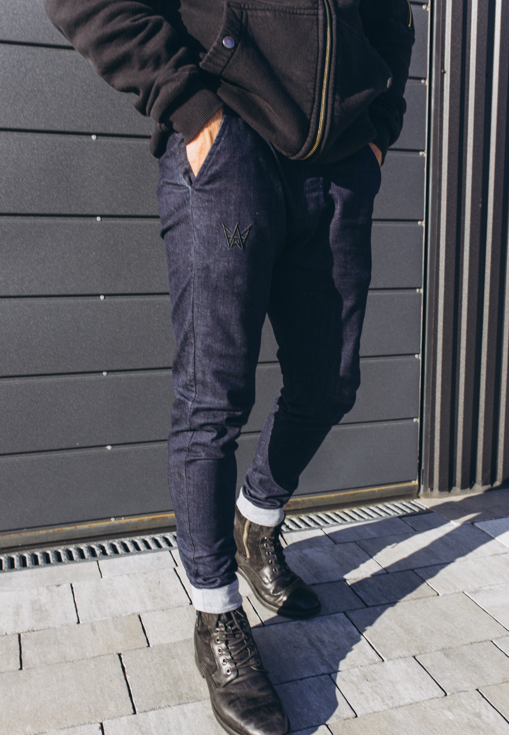 Dopasowane do sylwetki, spodnie jeansy z lycrą dla mężczyzn, którzy cenią wygodę i dobry design. Spodnie mają prosty krój z lekko zwężanymi nogawkami z szarym wykończeniem. Są regulowane w pasie – elastyczny ściągacz z bawełnianym sznurkiem. Z przodu znajdują się dwie proste kieszenie. Klasyczny granatowy kolor przypadnie do gustu każdemu mężczyźnie.